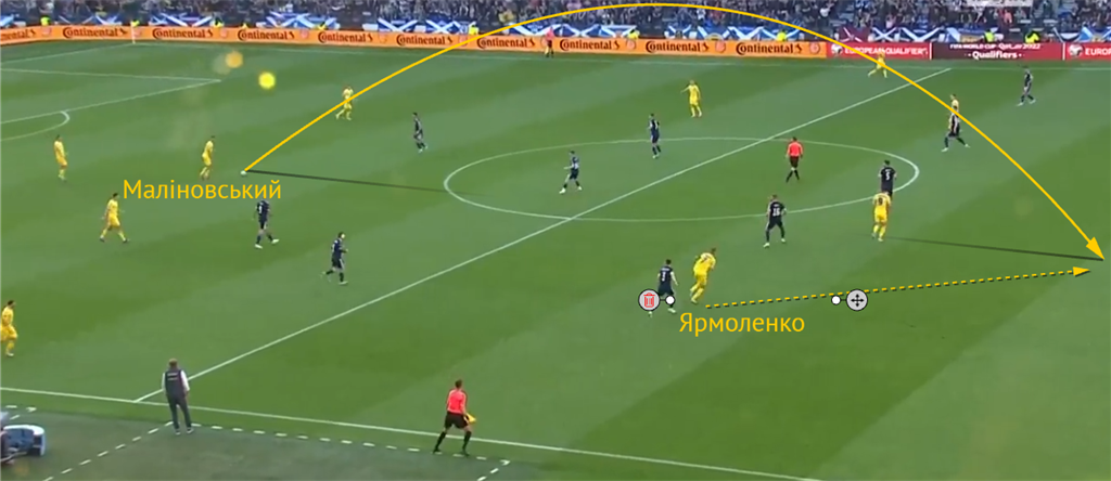 Очевидно, що це робота тренерського штабу збірної України. Невипадково Маліновський опинився настільки глибоко, а Ярмоленко в цей момент почав свій рух під можливу довгу вертикальну передачу.