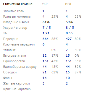 Та сама статистика покаже нам, що хоч ми і володіли територіальною перевагою, за кількістю ударів і моментів у нас з ірландцями паритет. Щоправда метрика xG показує, що якість наших моментів була вищою і ми могли розраховувати на перемогу в цьому матчі.