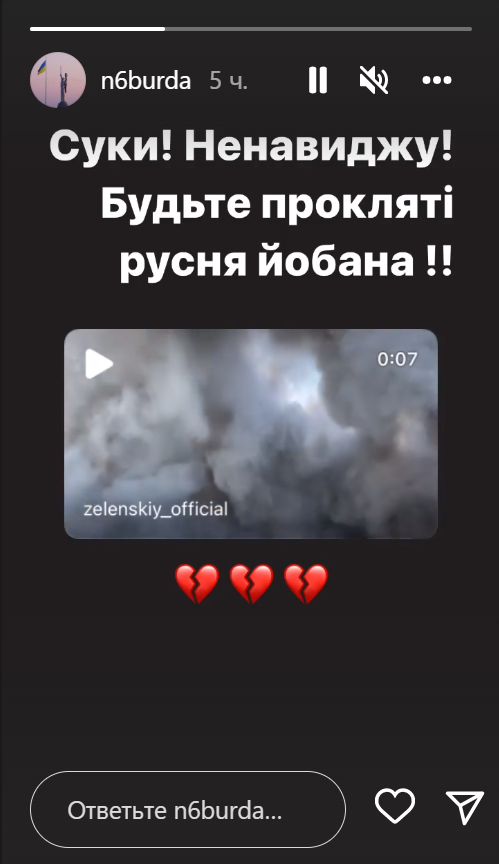 "Суки! Ненавиджу! Будьте прокляті, русня й*бана", — написав гравець у своєму Instagram-аккаунті.