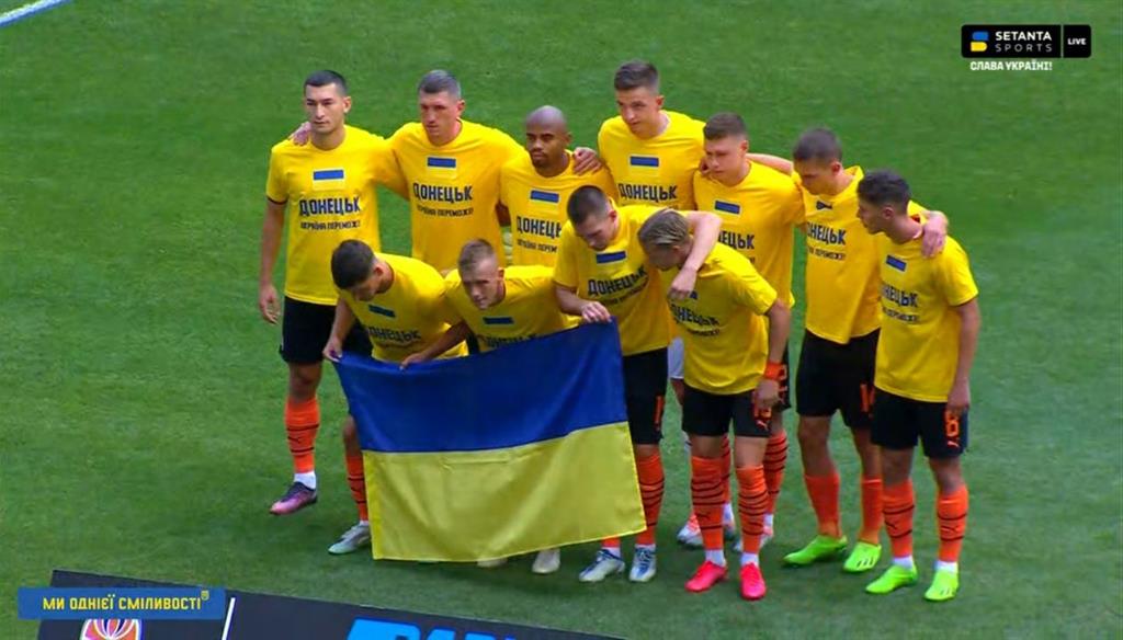 Відзначимо, що гравці Металіста 1925 грають проти "помаранчево-чорних" у футболках зі словами "Слава ЗСУ", а Шахтар вийшов на поле у футболках "Донецьк! Україна переможе!"