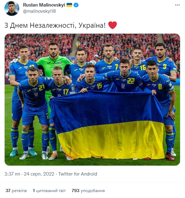 "З Днем Незалежності, Україно! ❤️" — написав Маліновський в своєму Twitter.