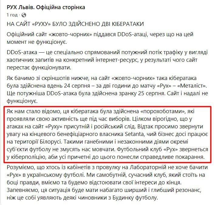 Сьогодні історія отримала продовження. Рух повідомив у своїх соцмережах, що на клубний сайт було скоєно дві кібератаки. Львів'яни навіть з'ясували джерело атак.