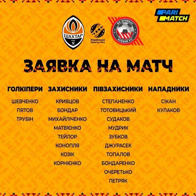 Донецький Шахтар у своєму офіційному твіттері опублікував заявку на матч другого туру української Прем'єр-ліги проти Кривбасу.