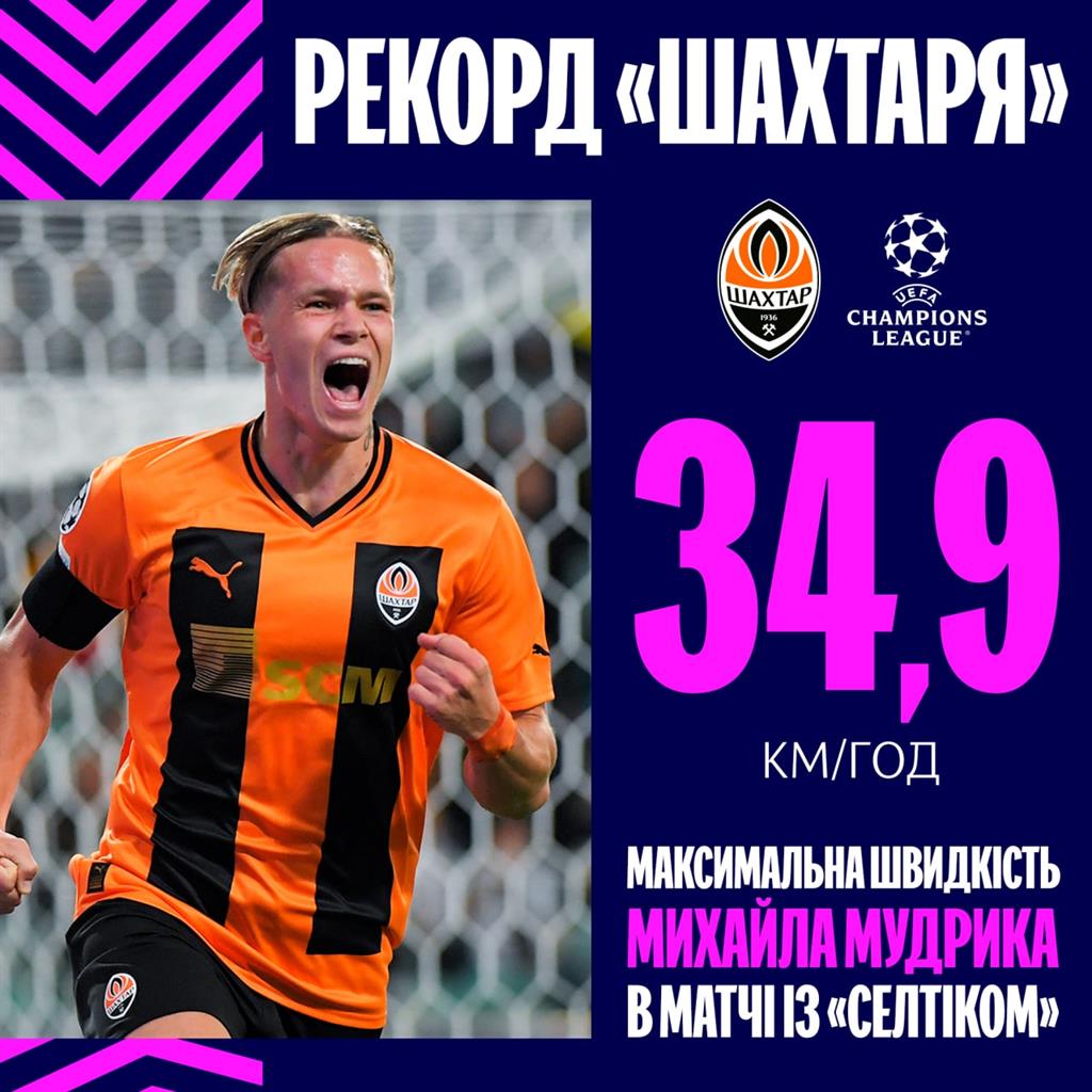 Як повідомляє прес-служба Шахтаря, проти шотландської команди Мудрик розвинув швидкість до 34,9 км/год, що є рекордом донецького клубу.