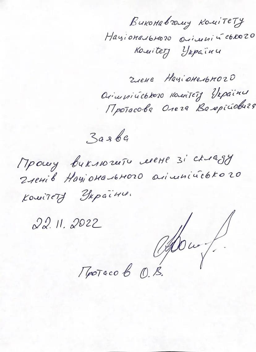 "Написав заяву при вихід зі складу членів Національного олімпійського комітету України. Чому? Відповідь очевидна. Вже минув тиждень з того часу, як стало відомо про входження до нового складу НОКу низки представників проросійської ОПЗЖ. А виключили з членів Комітету після широкого суспільного резонансу тільки двох з них. Решта лишаються на своїх місцях.