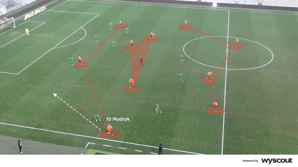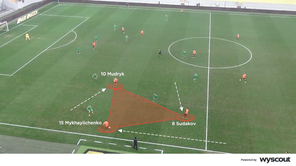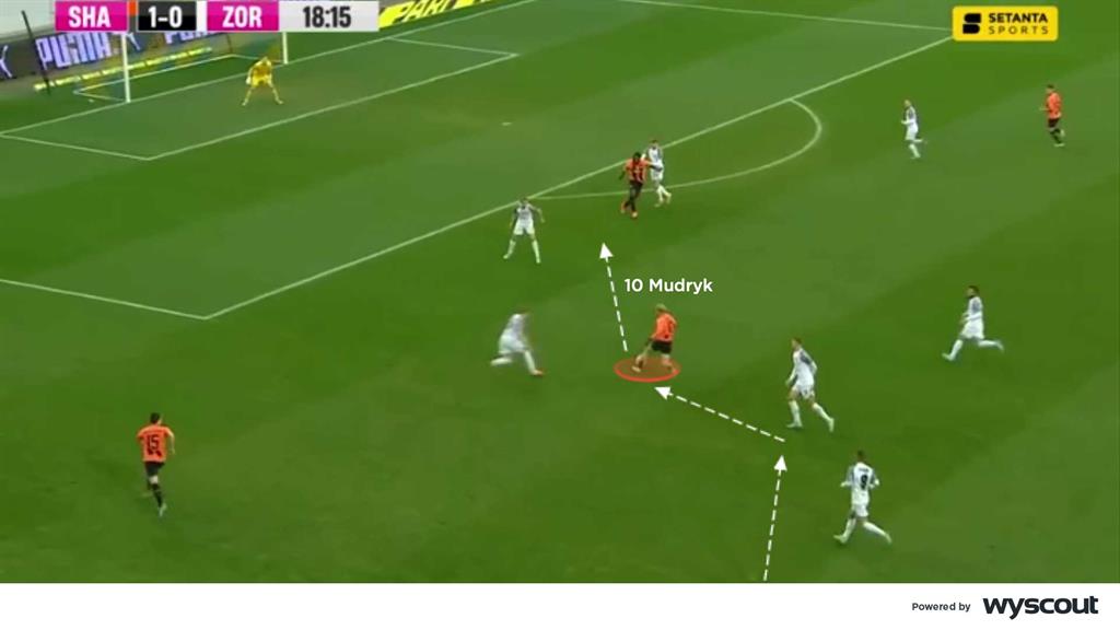 Мудрик рухається всередину, щоб потрапити на позиції між лініями для прийому м'яча. Центрфорвард Шахтаря затискає правого центрального захисника суперника, намагаючись обмежити те, наскільки вони можуть вискочити, щоб атакувати Мудрика, коли той робить перший дотик і вирішує.