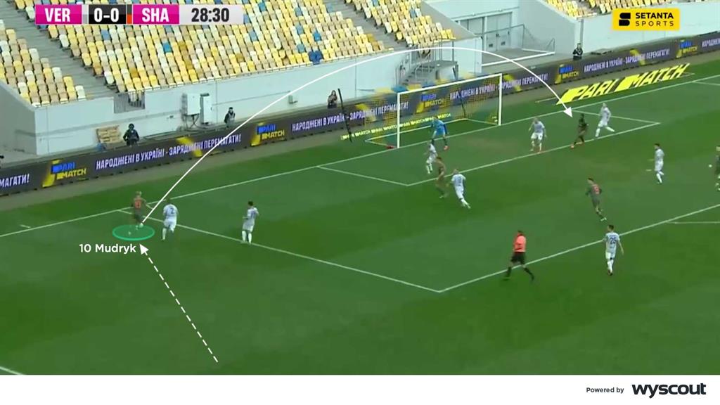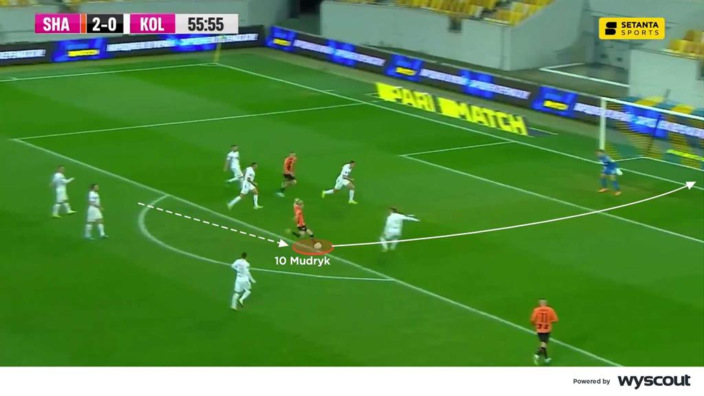 Його товариші по команді знають, наскільки він добре вміє робити навіси, і коли він атакує по боковій лінії, інші гравці в передній лінії Шахтаря, а також восьмий номер, а іноді навіть правий захисник будуть робити спринт, щоб потрапити в штрафний майданчик. Лівий захисник Михайліченко звузиться, щоб підтримати Мудрика, а в останній третині дасть ще один варіант.