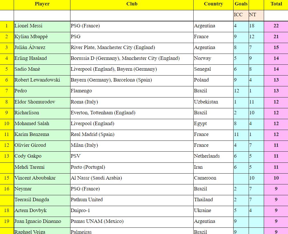 Трійку найкращих за аргентинцем доповнили форвард ПСЖ та збірної Франції Кіліан Мбаппе – 21 гол, і аргентинський нападник Манчестер Сіті Хуліан Альварес – 15 м'ячів.