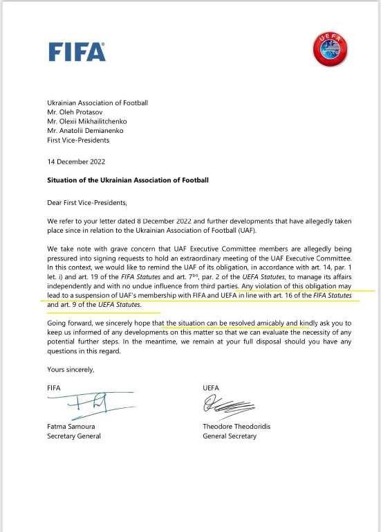 На офіційному сайті Української асоціації футболу з'явився лист від ФІФА та УЄФА, в якому було попередження щодо можливого виключення з цих організацій.