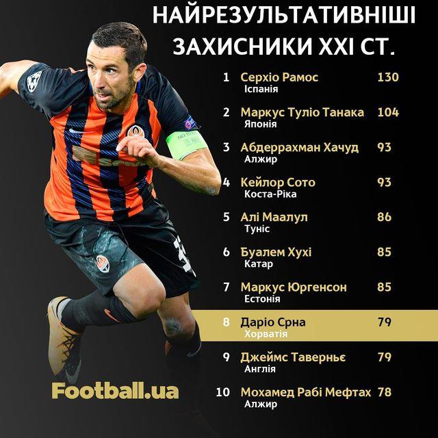 Зазначимо, що на восьмому рядку опинився колишній футболіст Шахтаря Даріо Срна – на рахунку хорвата 79 голів.