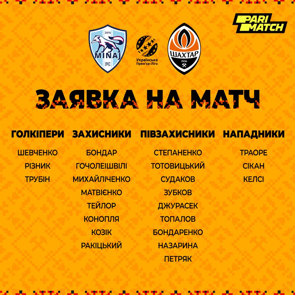 Донецький Шахтар опублікував заявку на майбутній перенесений матч дев'ятого туру УПЛ проти Миная.