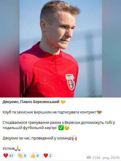 Верес у соцмережах повідомив про припинення співпраці із захисником Павлом Березянським, який став одним з переможців "народного відбору".