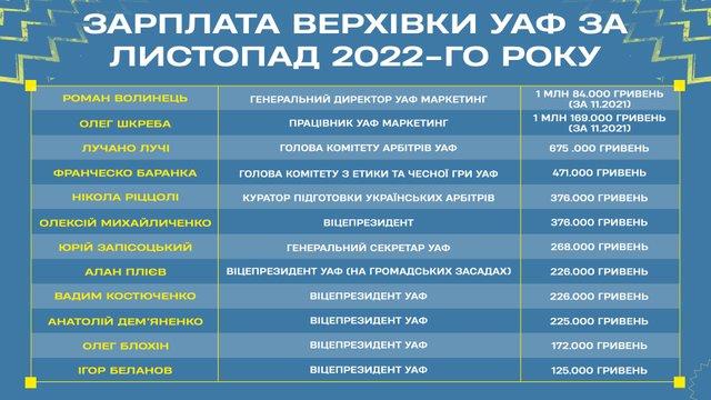 Віце-президент Олег Блохін отримує 172 тисячі гривень, Ігор Бєланов – 125 тисяч, Анатолій Дем'яненко – 225 тисяч, а Олексій Михайличенко – 329 тисяч.