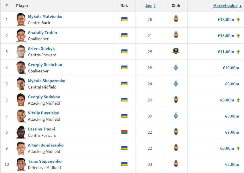 У ТОП-5 також потрапили нападник Дніпра-1 Артем Довбик — 11 мільйонів євро, воротар Динамо Георгій Бущан — 10 мільйонів євро, та півзахисник Динамо Микола Шапаренко — 9 мільйонів євро.