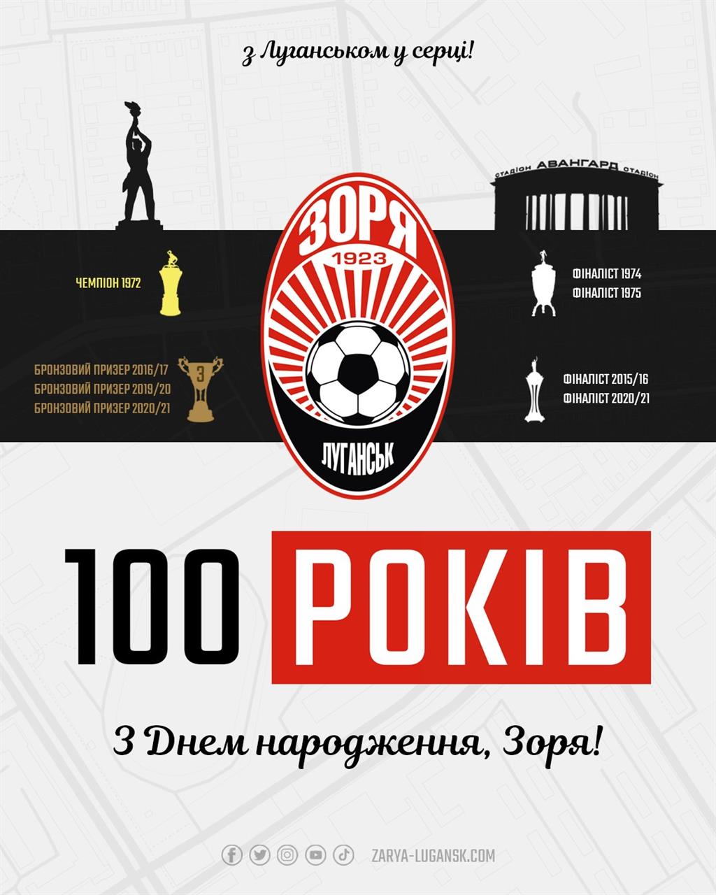 "Зі сторіччям, улюблений клуб! 5 травня 1923-го року, за назвою тоді ще Металіст почалася історія луганської Зорі — самобутнього клубу, який на власних прикладах показав, що не буває нічого неможливого!