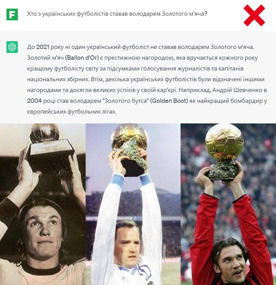 ВІДПОВІДЬ ChatGPT: "До 2021 року ні один український футболіст не ставав володарем Золотого м'яча".