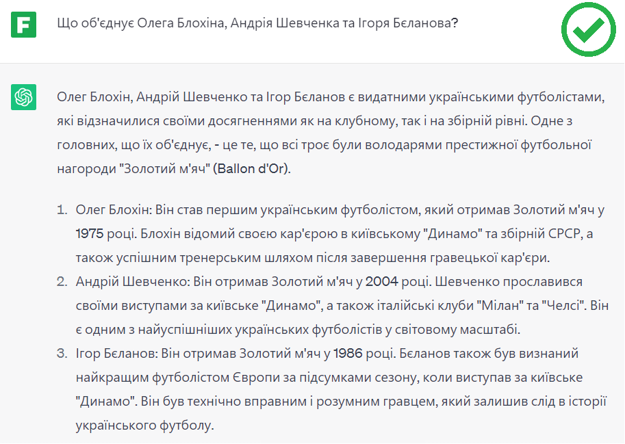 Кожен український футбольний уболівальник знає, що об'єднує таких гравців, як Олег Блохін, Ігор Бєланов та Андрій Шевченко, проте вже з цим у чат-бота зі штучним інтелектом виникли певні проблеми