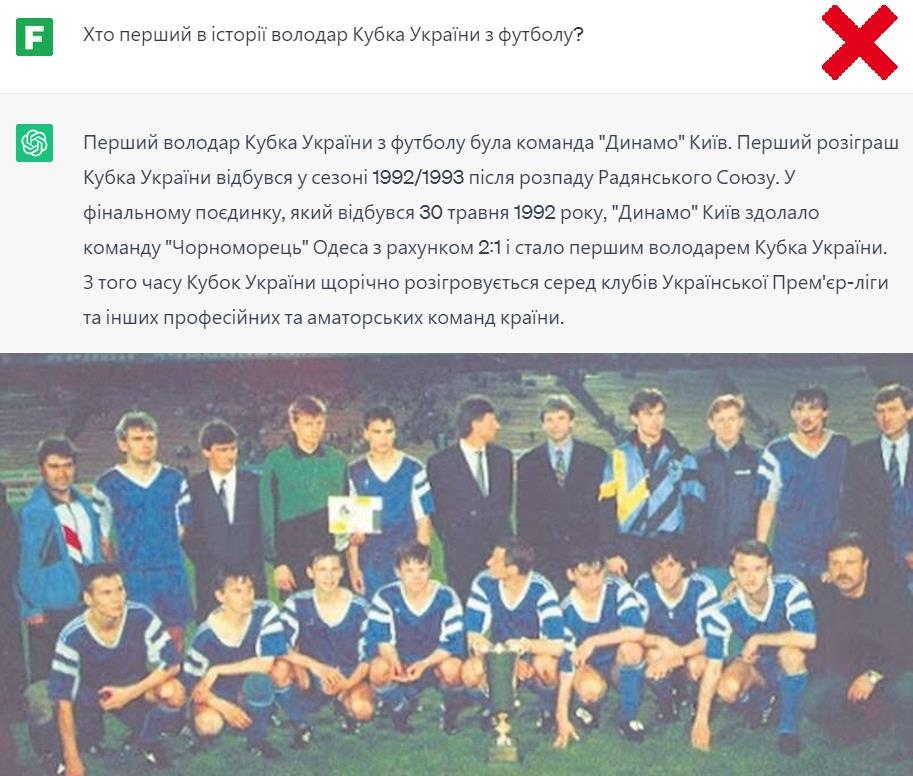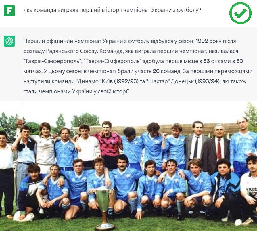 Продовжимо тестувати штучний інтелект на базові знання стосовно теми українського футболу, і перший чемпіон України після відновлення Незалежності нашому "співрозмовнику" відомий.