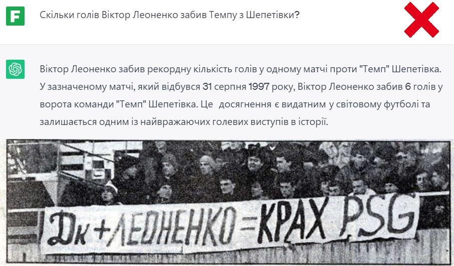 ВІДПОВІДЬ ChatGPT: "Віктор Леоненко забив рекордну кількість голів у одному матчі проти Темпу Шепетівка — 6. Це досягнення є видатним у світовому футболі та залишається одним із найвражаючих виступів в історії".