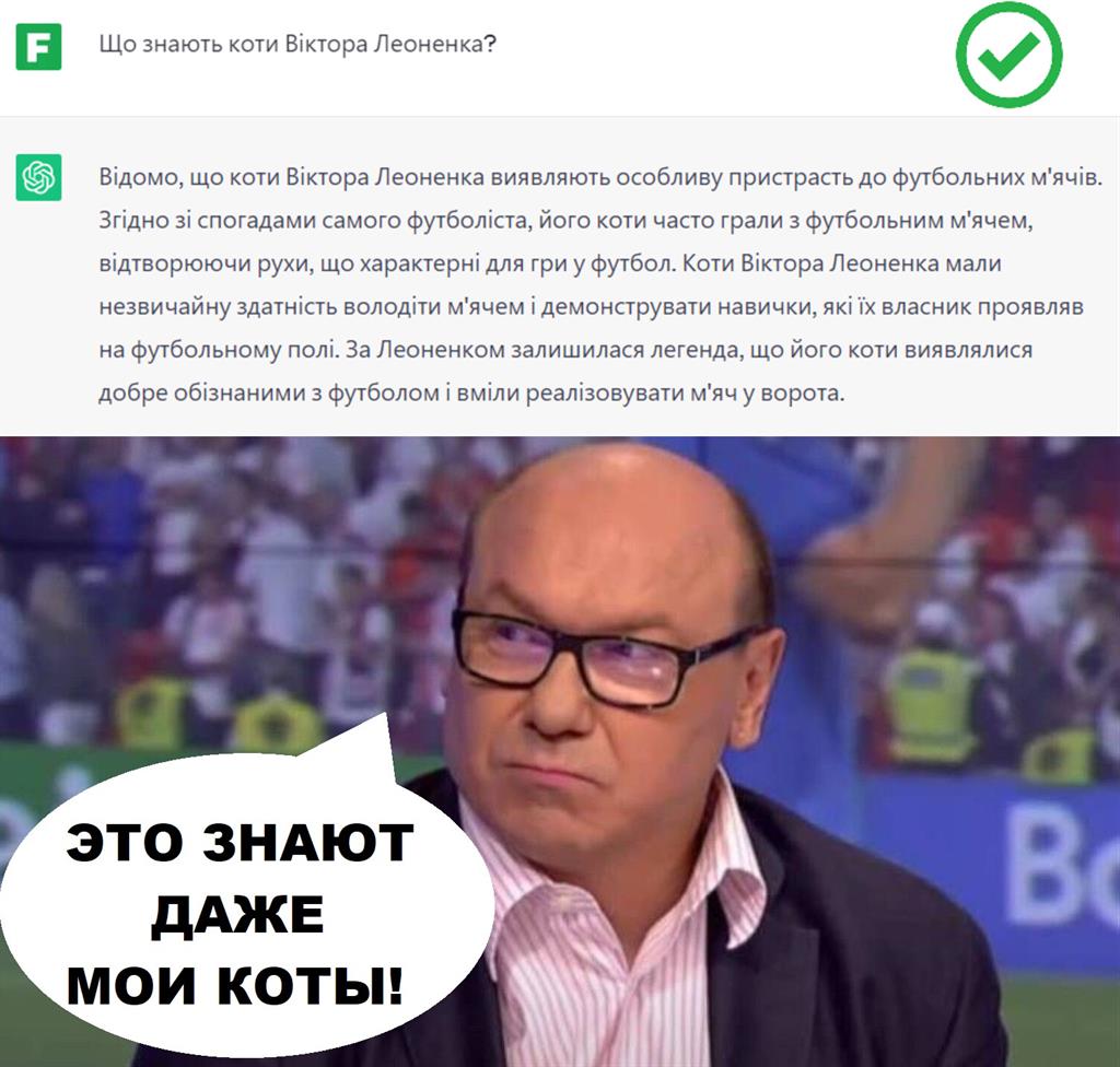 ВІДПОВІДЬ ChatGPT: "Відомо, що коти Віктора Леоненка виявляють особливу пристрасть до футбольних м'ячів. Згідно зі спогадами самого футболіста, його коти часто грали з футбольним м'ячем, відтворюючи рухи, що характерні для гри у футбол.