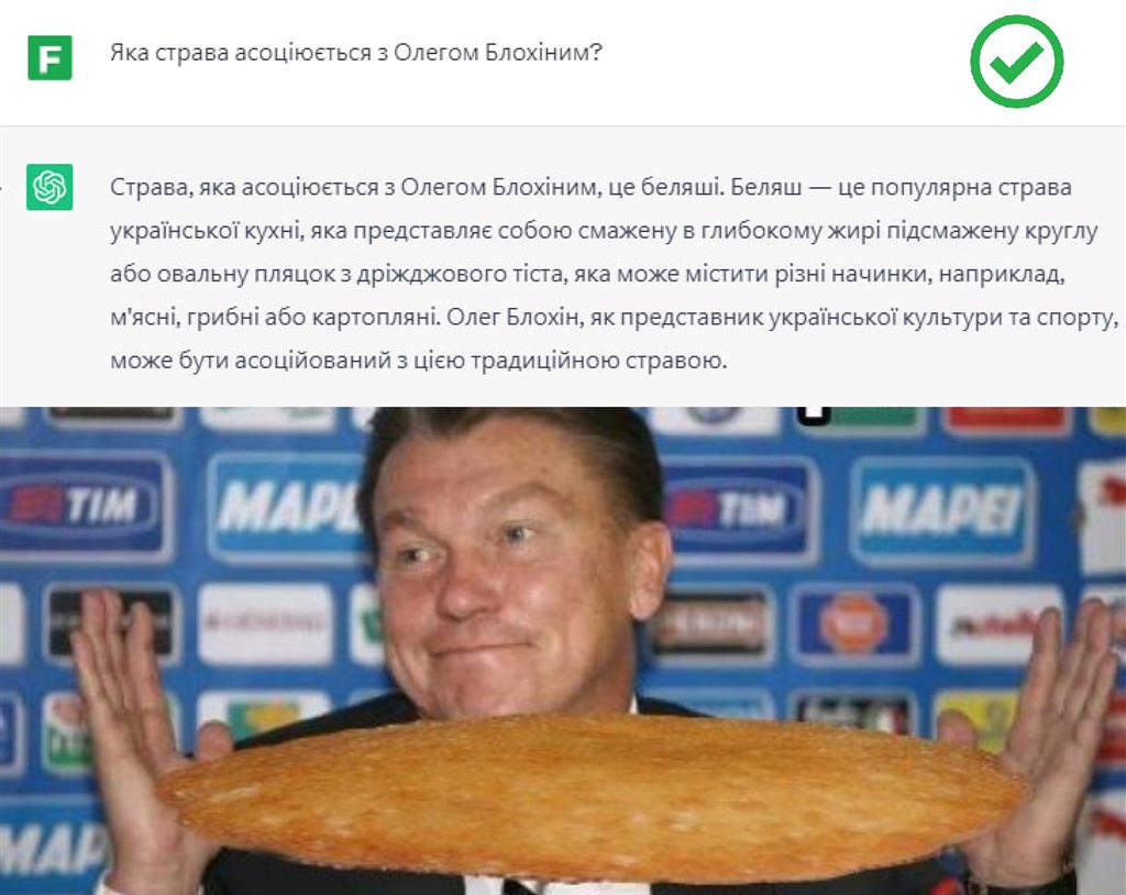 ВІДПОВІДЬ ChatGPT: "Страва, яка асоціюється з Олегом Блохіним, це біляші".