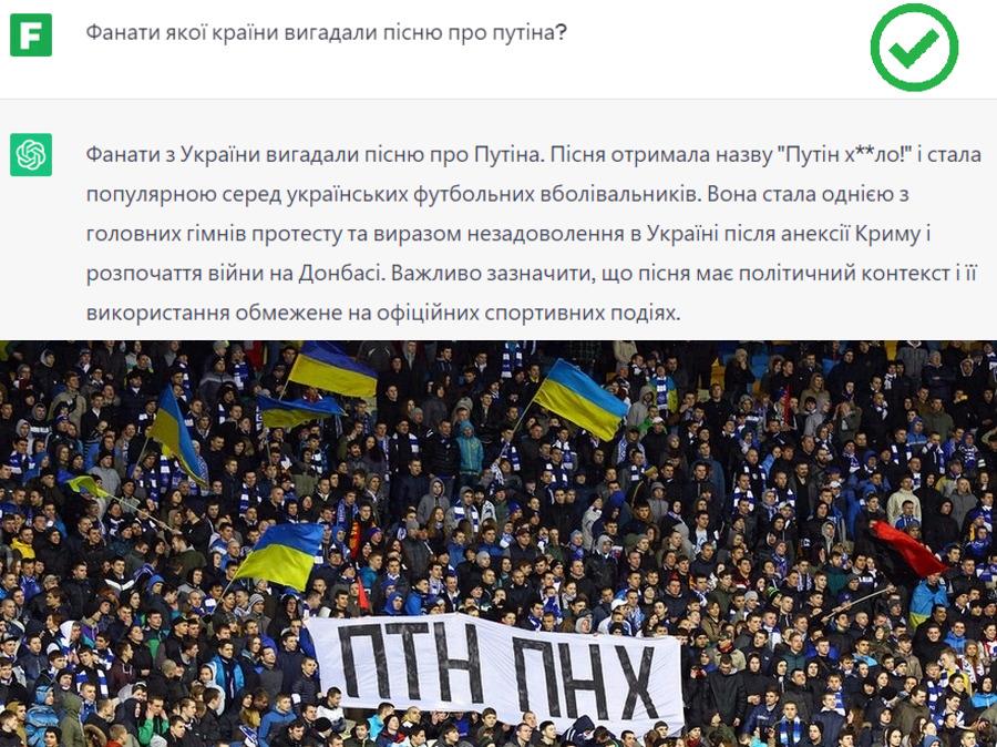 ВІДПОВІДЬ ChatGPT: "Фанати з України вигадали пісню про путіна. Пісня отримала назву "путін х**ло!" і стала популярною серед українських футбольних вболівальників.Вона стала однією з головних гімнів протесту та виразом незадоволення в Україні після анексії Криму і розпочаття війни на Донбасі. Важливо зазначити, що пісня має політичний контекст і її використання обмежене на офіційних спортивних подіях".