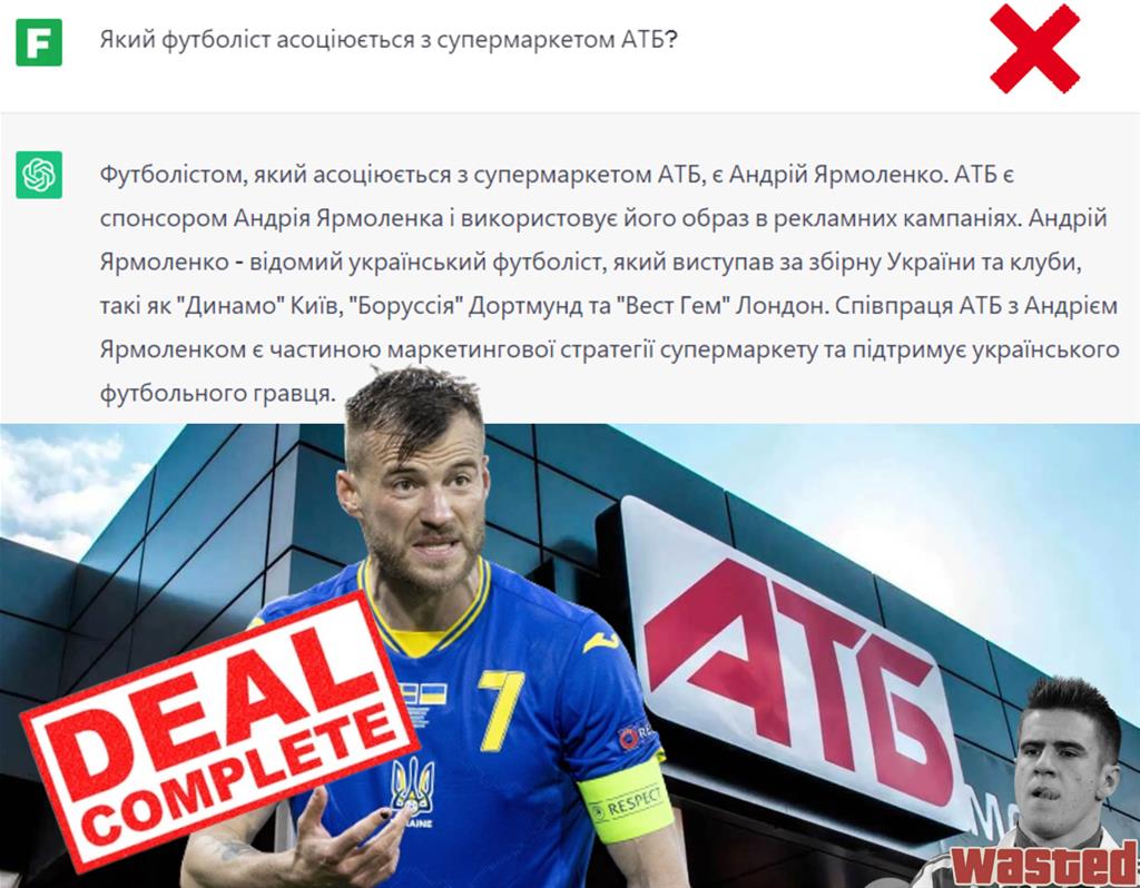ВІДПОВІДЬ ChatGPT: "Футболістом, який асоціюється з супермаркетом АТБ, є Андрій Ярмоленко. АТБ є його спонсором і використовує його образ в рекламних кампаніях. Співпраця АТБ з Андрієм Ярмоленком є частиною маркетингової стратегії супермаркету та підтримує українського футбольного гравця".