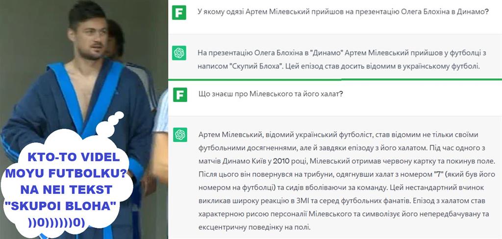 ВІДПОВІДЬ ChatGPT: "На презентацію Олега Блохіна в Динамо Артем Мілевський прийшов у футболці з написом "Скупий Блоха". Цей епізод став досить відомим в українському футболі.