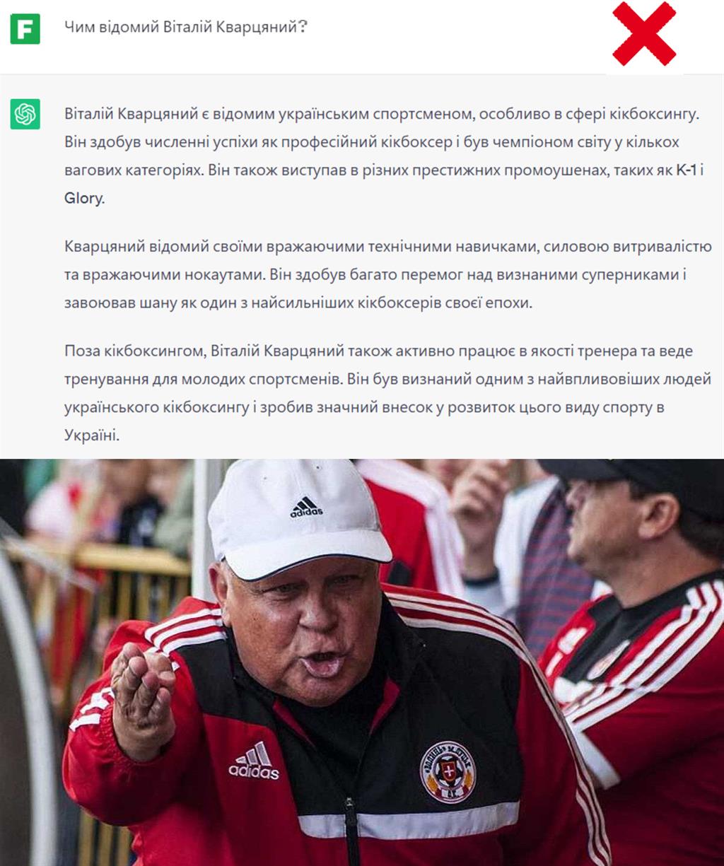 ВІДПОВІДЬ ChatGPT: "Віталій Кварцяний є відомим українським спортсменом, особливо в сфері кікбоксингу. Він здобув численні успіхи як професійний кікбоксер і був чемпіоном світу у кількох вагових категоріях. Він також виступав в різних престижних промоушенах, таких як K-1 і Glory.
