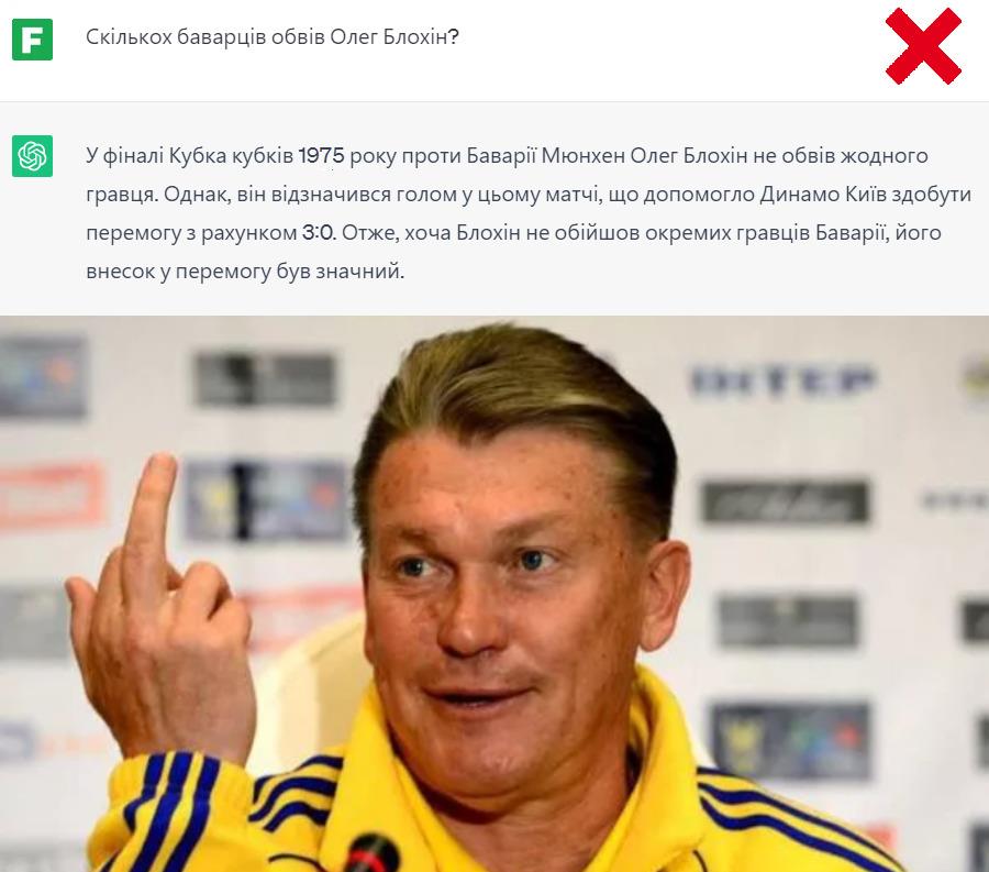 ВІДПОВІДЬ ChatGPT: "Проти Баварії Олег Блохін не обвів жодного гравця, проте відзначився голом у тому матчі. Отже, хоча Блохін не обійшов окремих гравців Баварії, його внесок у перемогу був значний".