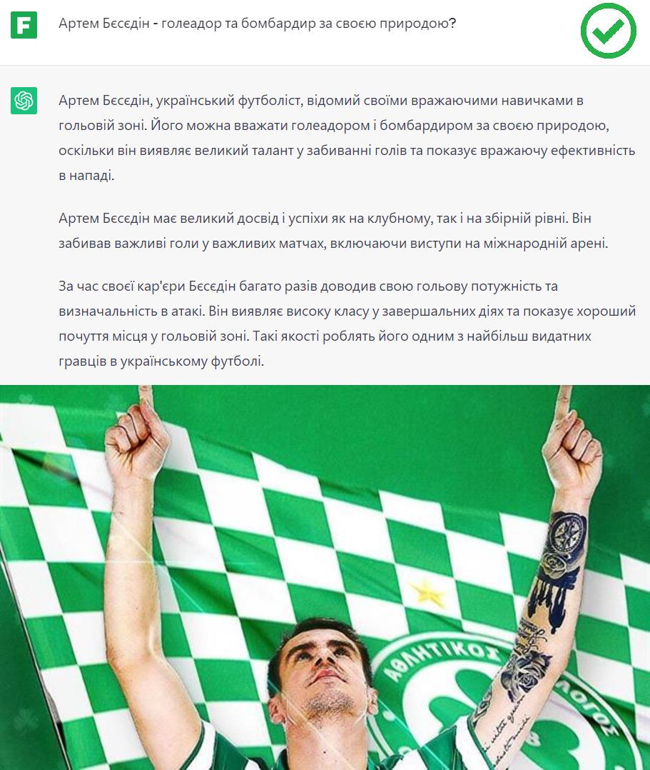 ВІДПОВІДЬ ChatGPT: "Артем Бєсєдін відомий своїми вражаючими навичками в гольовій зоні. Його можна вважати голеадором і бомбардиром за своєю природою, оскільки він виявляє великий талант у забиванні голів та показує вражаючу ефективність в нападі. Ці якості роблять його одним з найбільш видатних гравців в українському футболі".