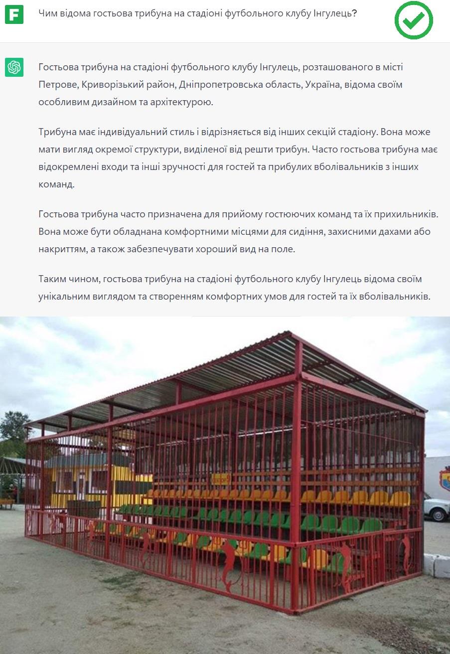ВІДПОВІДЬ ChatGPT: "Гостьова трибуна стадіону Інгльця відома своїм особливим дизайном та архітектурою. Вона має індивідуальний стиль і відрізняється від інших секцій стадіону, має вигляд окремої структури, виділеної від решти трибун.