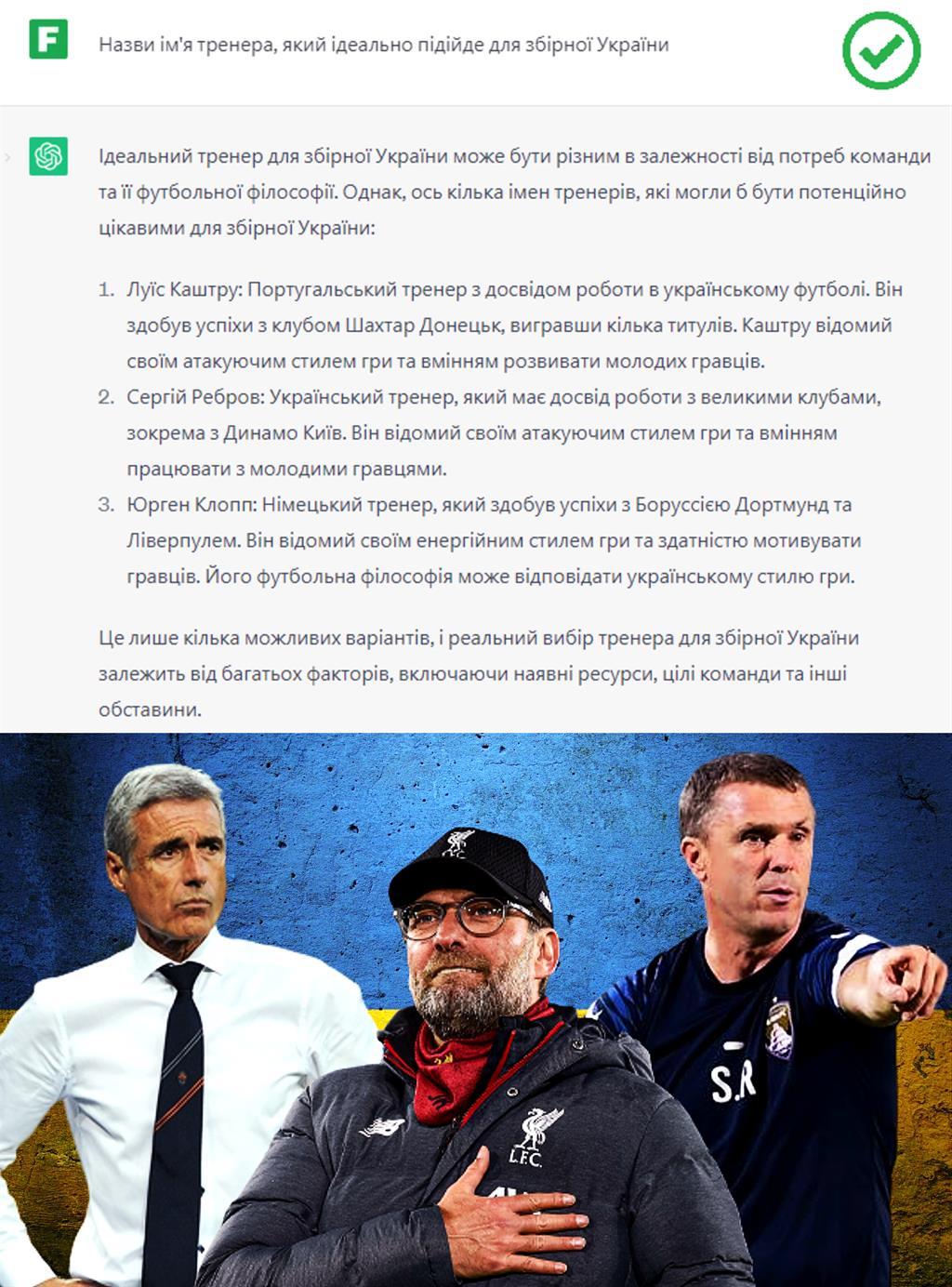 ВІДПОВІДЬ ChatGPT: "Ось кілька імен тренерів, які могли б бути потенційно цікавими для збірної України: 1. Луїш Каштру, 2. Сергій Ребров, 3. Юрген Клопп".