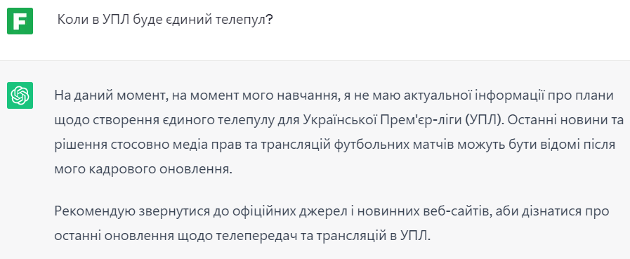 ВІДПОВІДЬ ChatGPT: "На даний момент, на момент мого навчання, я не маю актуальної інформації про плани щодо створення єдиного телепулу для Української Прем'єр-ліги (УПЛ)".