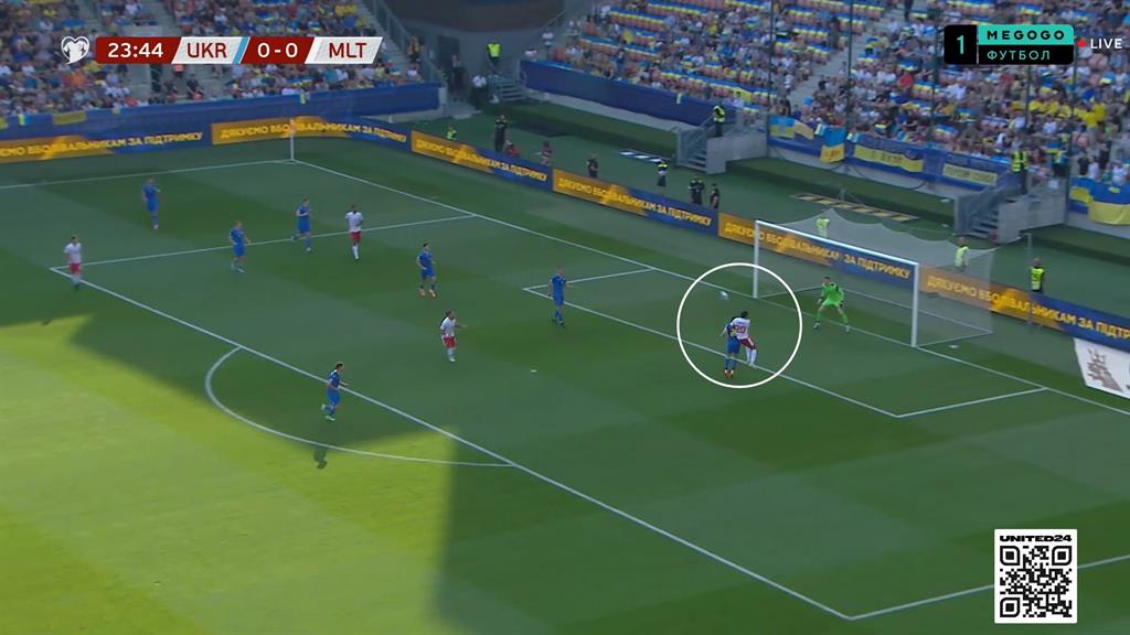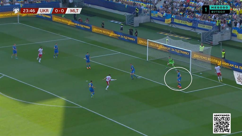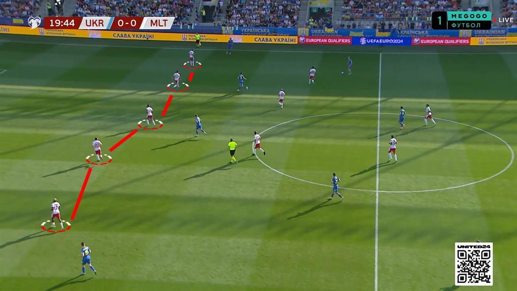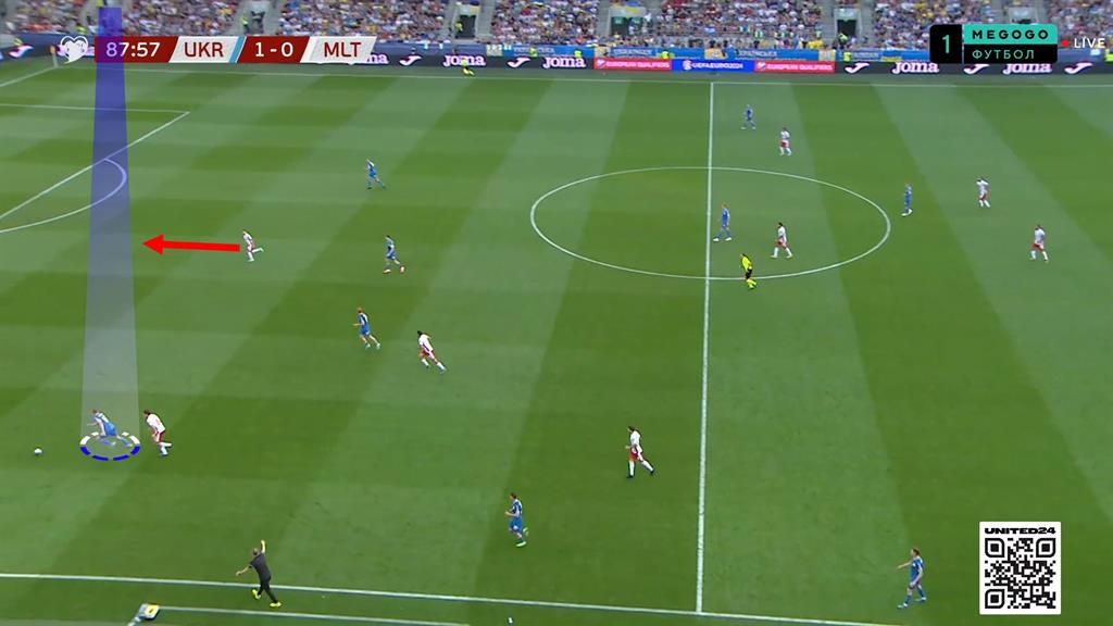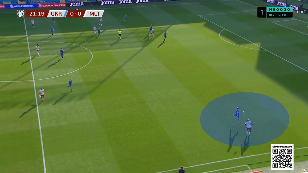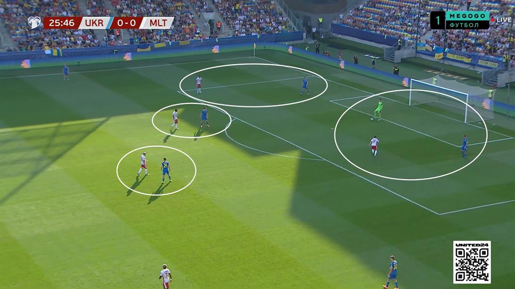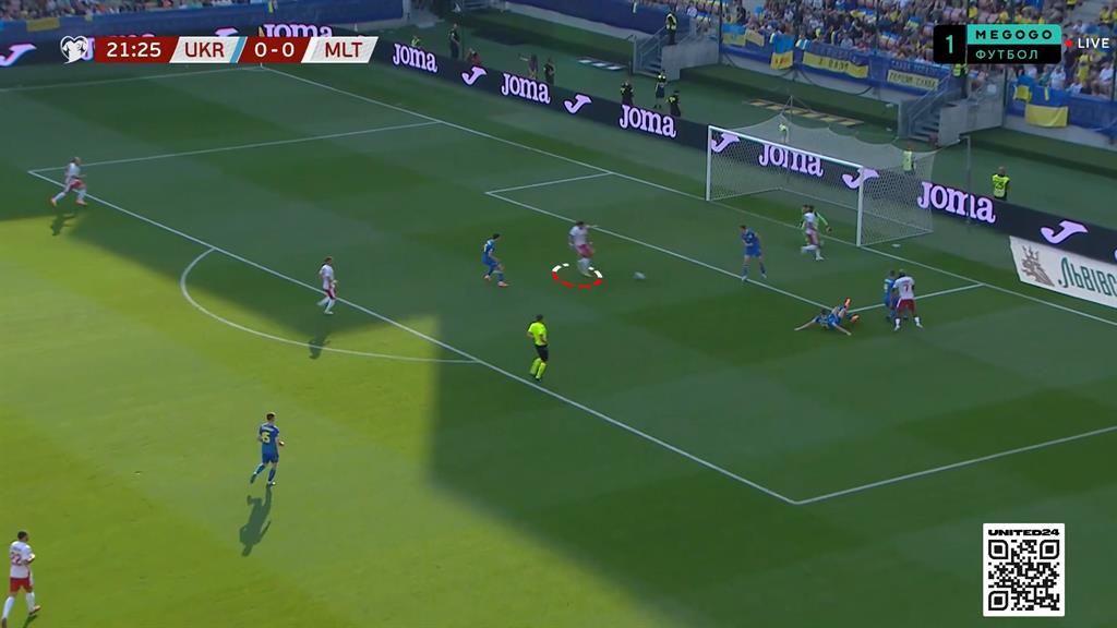 Нерідко це призводило до втрат. Ось, наприклад, один з епізодів коли вдалося затиснути захисника на фланзі, один гравець збірної Мальти витягується на Іллю Забарного, а інший перекриває лінію передачі на голкіпера, через що захисник змушений вибивати м'яч вперед.