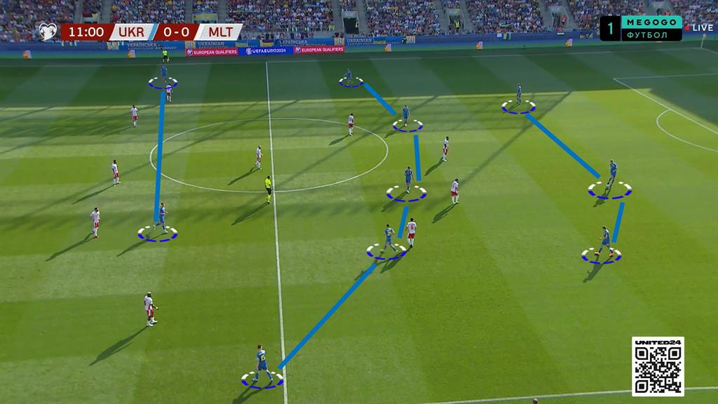 Окремо варто сказати про черговий невдалий матч Миколи Матвієнка. В цьому поєдинку він діяв в якості фактично лівого крайнього захисника. Все через нову структуру збірної України в атаці. Вона являла собою класичні 4-3-3, де Руслан Маліновський та Георгій Судаков виконували роль інсайдів, а Віктор Циганков цього разу діяв не в парі з нападником, а в якості лівого вінгера, проте була гібридною, тому що ситуативно переходила у 3-5-2 із варіаціями.