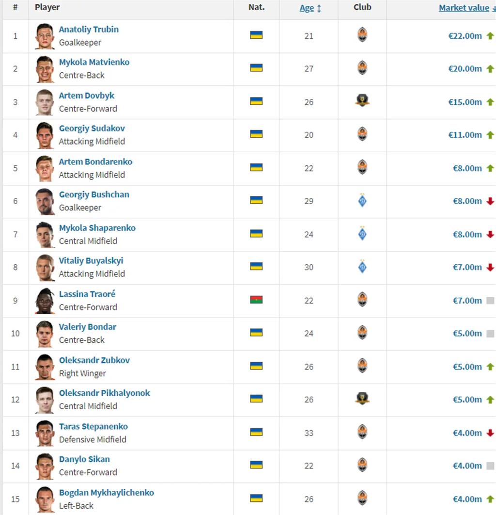 Найдорожчим гравцем УПЛ є воротар донецького Шахтаря Анатолій Трубін, ціна якого зросла з 18 мільйонів євро до 22.