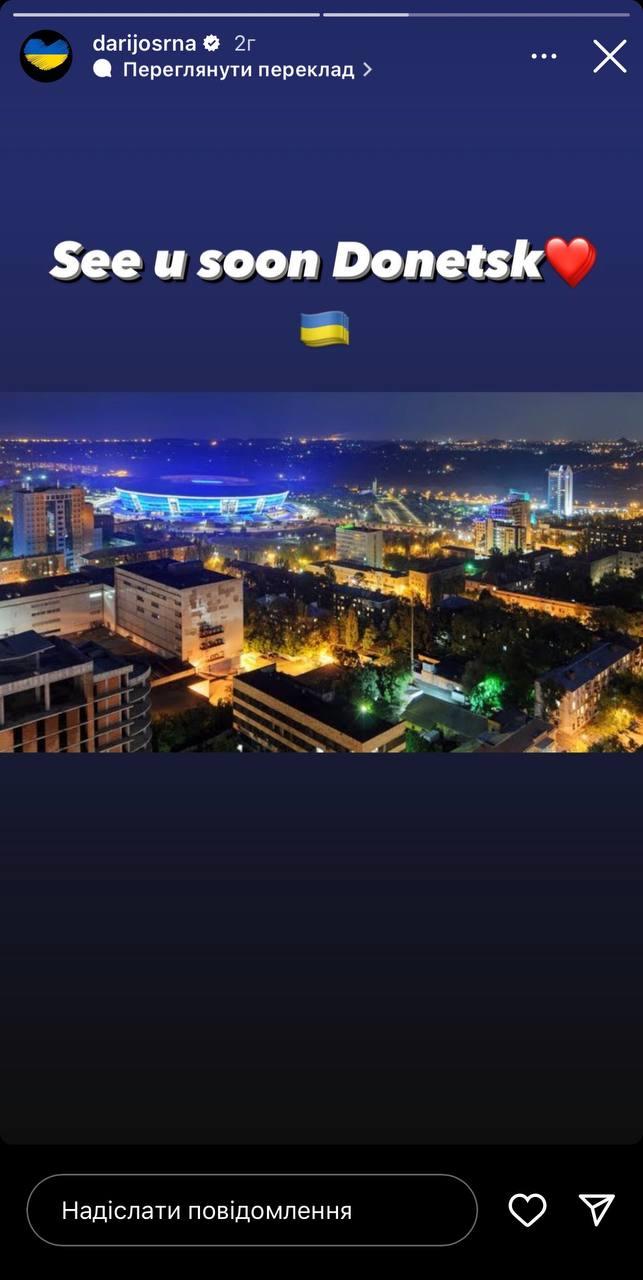 "Скоро побачимося, Донецьк", — написав хорватський ексфутболіст та футбольний функціонер в Instagram Stories, прикріпивши емодзі серця та прапора України.