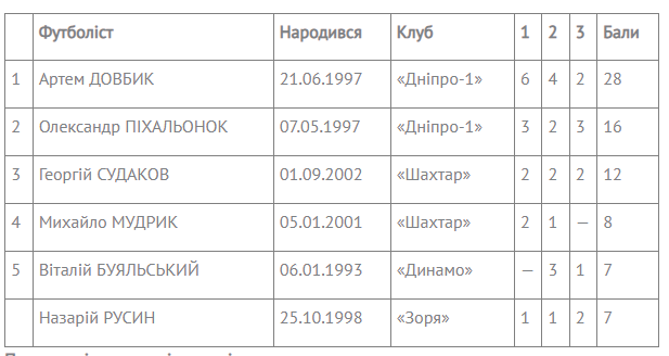 Як повідомляє офіційний сайт організації, переможцем став форвард Дніпра-1 Артем Довбик.