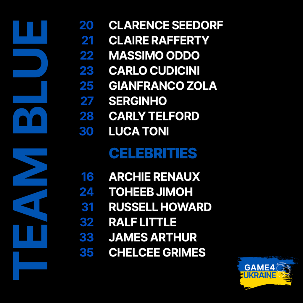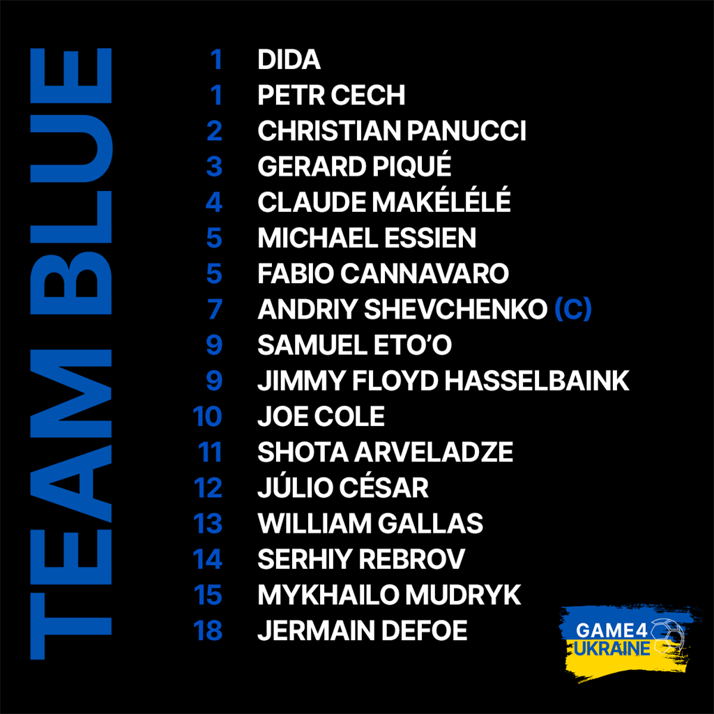 На офіційному сайті цього івенту з'явився остаточний склад команди Андрія Шевченка, яка зіграє у синій формі під керівництвом Емми Хейз, що очолює жіночу команду лондонського Челсі.