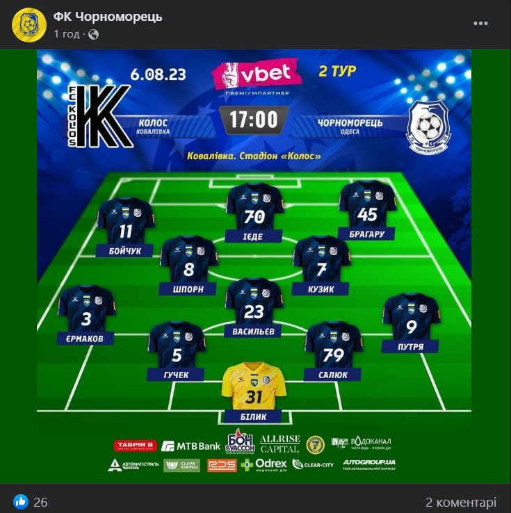 За кілька хвилин до старту матчу інформація щодо складів Колоса та Чорноморця на сайті УПЛ виглядала наступним чином: