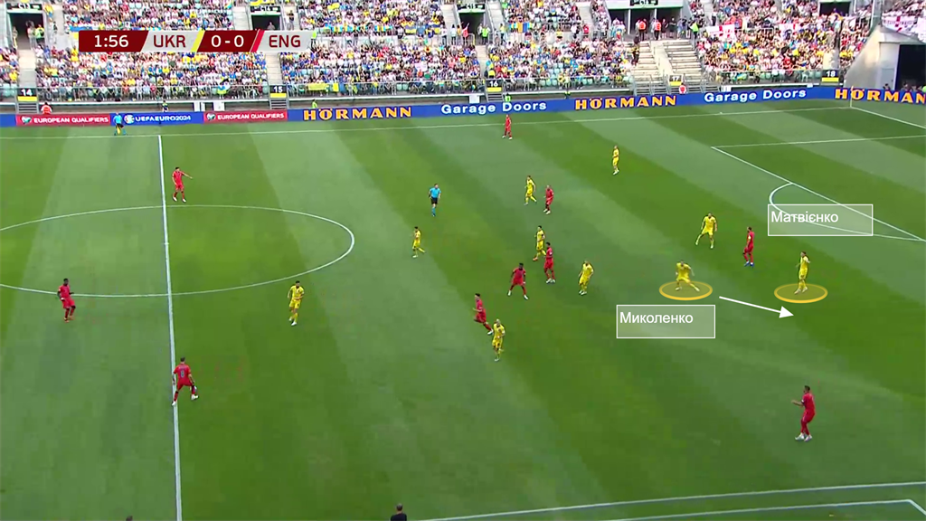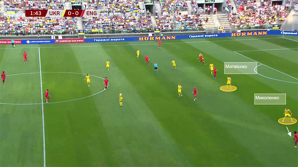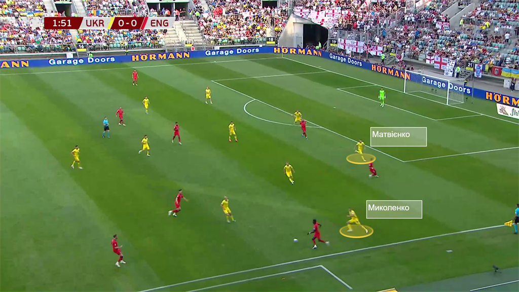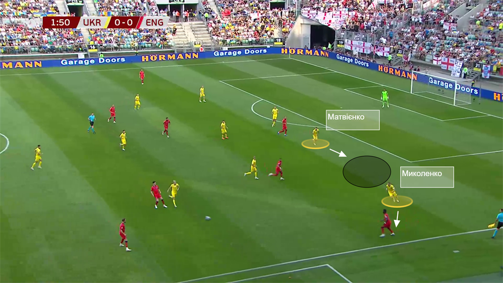 Дуже важливим компонентом в цьому аспекті була компенсація простору захисниками. Кожен з них розбирав суперників за ланцюжком, а інший займав його простір. Один із деяких прикладів. Віталій Миколенко пішов до максимуму за своїм футболістом, а Микола Матвієнко змістився за своїм гравцем та зайняв простір за латералем Евертона. В підсумку Віталій знову повернувся у свій коридор, як і інші футболісти. Саме подібна впевнена гра в захисті та чітке розуміння ігрового контексту у конкретному матчі дозволило мінімізувати ризики від колективу Гарета Саутгейта.