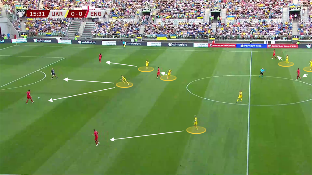 Також потрібно зазначити чудову гру у перехідних фазах. Конкретно виділяючи перехід від оборони до атаки треба відзначити хорошу взаємодію наших футболістів. Долати компактний середній блок "трьох левів" переважно вдавалося за рахунок швидкої циркуляції м'яча. Можливо, у завершальній фазі були певні питання, коли приймалися поспішні рішення, втім якщо говорити комплексно, у цьому компоненті національна збірна провела впевнений поєдинок.