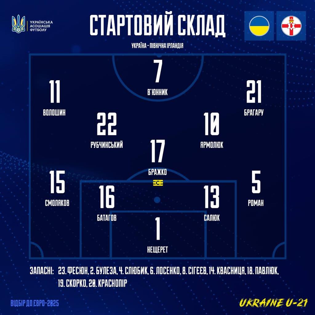 Стали відомі стартові склади України U-21 та Північної Ірландії U-21 на матч кваліфікації до Євро-2025.
