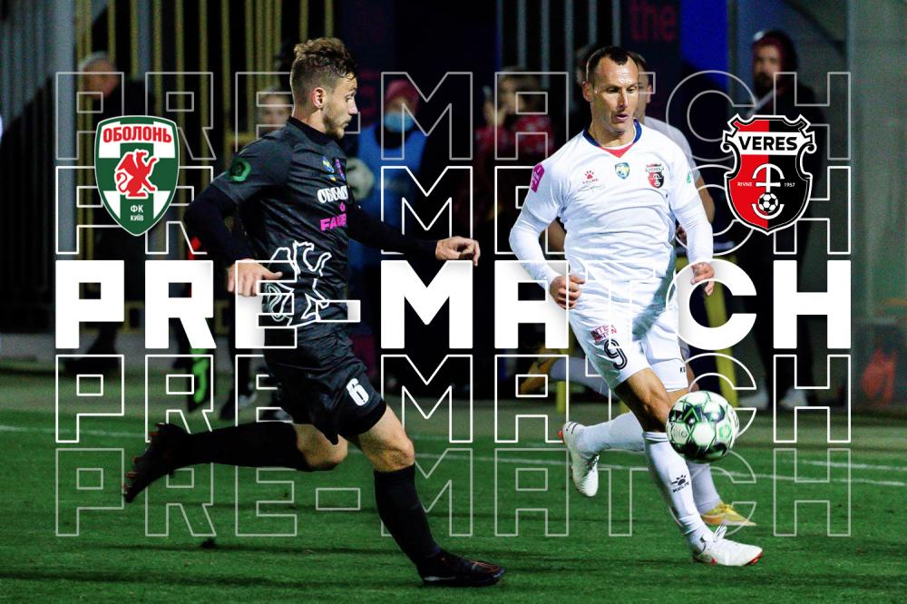 В минулому турі Верес грав на виїзді проти міцного Кривбасу та зазнав поразки з рахунком 1:2. Команда довгий час претендувала на нічию, проте пропустила на 85 хвилині. Верес програв шість матчів поспіль на виїзді в рамках чемпіонату України, проте має позитивну статистику очних протистоянь проти Оболоні — рівняни виграли три останніх зустрічі та ніколи не поступались супротивнику.