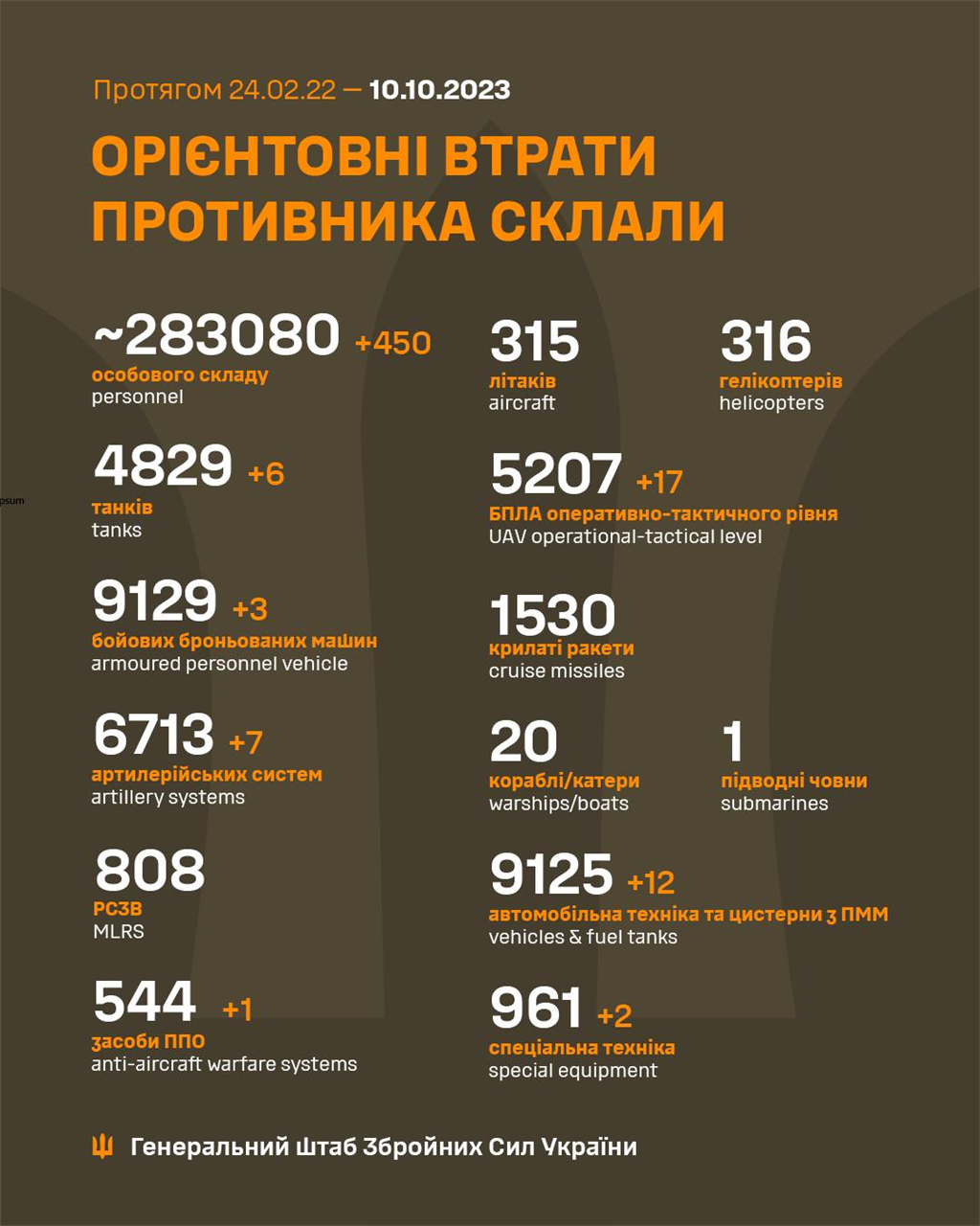 До вашої уваги інформація щодо російського вторгнення в Україну за підсумками 10 жовтня 2023 року.