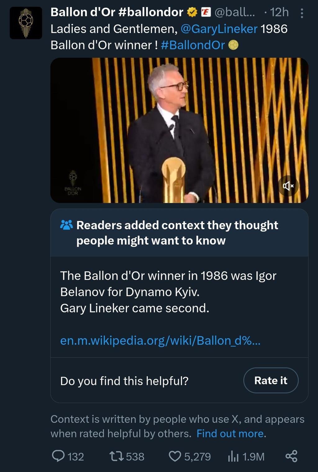 Однак під час церемонії офіційний акаунт премії у твіттері написав, що володарем Золотого м'яча 1986 року є не Бєланов, а англієць Гарі Лінекер, який тоді став другим.
