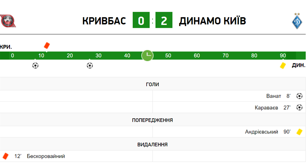 Долю поєдинку вирішило видалення Бескоровайного в дебюті зустрічі. Кияни скористались більшістю та забили двічі — голи на рахунку Ваната та Караваєва.