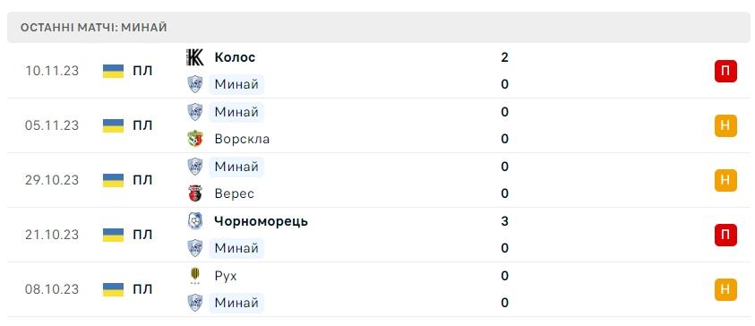 Минай – єдина команда поточного Чемпіонату, яка ще не перемагала: 6 нічиїх та 8 поразок.