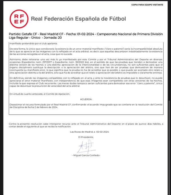 Але менш аніж за дві доби до початку матчу на Сантьяго Бернабеу на адресу "королівського" клубу надійшла відповідь, що рішення головного арбітра Рікардо Де Бургоса Бенгоечеа з Більбао залишиться в силі.